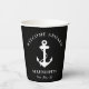 Modernas tazas de papel de temática náutica para tu barco que cuentan con un ilustracion blanco de un ancla sobre un fondo negro. Personalice el texto "Welcome Aboard" y el nombre y ubicación de su barco en una elegante tipografía blanca.