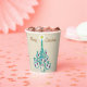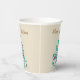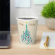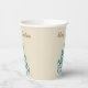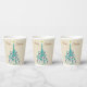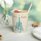 Hermosa taza de papel con una pintura digital original de Leslie Sigal Javorek de un turquesa árbol de Navidad con ornamentos violeta en un fondo Trompe L'oeil (truco del ojo), ilusión de porcelana de hueso fino y mayor profundidad.