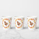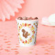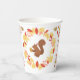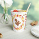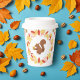 Una ardilla que da felicidad sostiene una nuez de regalo de la abundante cosecha del otoño. Las hojas de limón amarillo, siena quemada y coral adornan la escena.