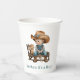 ¡Sí, es un niño! tazas de papel para la ducha de temática occidental, con adorables gráficos de un bebé vaquero sentado en un banco, con su caballo relleno y su pequeña cuerda de lazo. Personalice el texto azul federal para adaptarlo a sus necesidades de eventos.