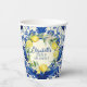 Celebre la mami con estas vintage baldosas azules mediterráneas y tazas de papel inspiradas en el limón. Estas tazas de papel Baby Shower de azulejos y limones de color azul vintage se pueden personalizar con tus propios detalles. El diseño presenta un fondo de azulejos azul vintage con una obra de arte realista sobre limón.