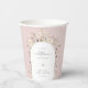 Copas de papel de Baby Shower con flores silvestres. Marco de arco de flores silvestres coloridas, acento de mariposa, tipografía de color gris oscuro de moda y fondo de color rosado coordinado.