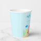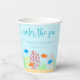 Ducha de bebé de vida marina con naranja y peces azules jugando entre un arrecife de coral y algas marinas, en medio de burbujas oceánicas.