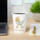 Cuidados tazas de papel para la ducha neutra de género que cuentan con una acuarela color verde menta pastel y retro dorado y el nombre de la futura madre en un guión elegante. Personalice el texto en el carro de bebés o deje en blanco.