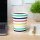 Un refrigerador de bebidas colorido con un patrón a rayas. El refrigerador es principalmente blanco con rayas horizontales en azul marino, rosa, amarillo, turquesa y azul marino. Está diseñado para adaptarse a una lata de bebidas estándar.