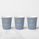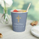 Cups personalizadas de papel de baptismo de chico azul con cruces religiosas.