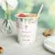 Para un bautismo elegante, neutral en cuanto a género. Un fondo blanco moda. Decoradas con flores blancas de color acuático, peonías y hojas de eucalipto verde, espirales, vegetación, hojas de oro falsas. Una falsa cruz de oro. Personalice y agregue el nombre del niño y una fecha. Letras negras y doradas.