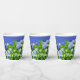 Ducha de novia tazas de papel floral con flores de hidrangea azul. Los arbustos verdes llenos de hermosas flores azules rodean tazas de papel para usarlas en una ducha nupcial, en una fiesta de cumpleaños o en cualquier evento con un tema de jardín. Incluya texto en la parte inferior como "La ducha de novia de Alyssa", o elimine la redacción para comprar en blanco.