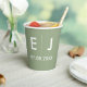 Elegantes tazas de papel monogramadas clásicas en verde sabio y blanco con sus iniciales y fecha boda en texto minimalista tradicional.