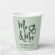 tazas de papel verde personalizado para la recepción de bodas y los eventos. "Mr & Mrs." está escrito en un gran guión junto a un ilustracion de dos anillos bodas juntos. Personaliza con tu apellido y fecha de boda.