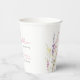 Elegant paper cups for your baby girl shower featuring "a little wildflower is on her way" showcased in a blend of light grey typography and a whimsical pink script, and a boho-inspired watercolor bouquet of pink, purple, and yellow wildflowers.