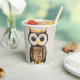 An owl with big eyes, completely made of wood pieces. The wood streaks and veins complete the design elegantly.
