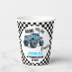 Boys Blue Monster Truck Cups de papel de cumpleaños Monster Cups de papel con tema de camión de cumpleaños para niños con un camión azul, banderas de carreras y varios textos en texto fluorescente negro y azul. Puede utilizarse para cualquier edad.