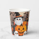 Vasos de papel para fiesta de Halloween adorables. Con búhos fantasmales, linternas de calabaza, calabazas y una casa embrujada espeluznante.