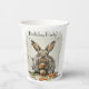 La copa de cumpleaños incluye un adorable conejito regordete frente y centro, masticando alegremente en un muffin gigante. Con su vientre redonda, sus mejillas suaves y sus diminutas patas que sujetan el regalo, el conejito luce con mucho cuidado y contento.