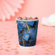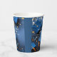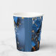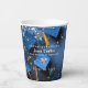Elegantes tazas de papel con Caduceo, birretes azules con borla dorada, para el graduado de medicina. Fondo bonito en azul marino con confeti dorado y birrete azul. Agrega tu nombre, universidad y año de graduación.