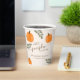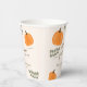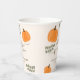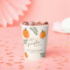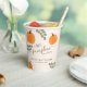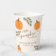 Un lindo tazas de papel para la ducha neutra de género con tema de otoño. Este diseño cuenta con un moderno tipo de letra de caligrafía, calabazas naranjas y ramas verdes de Eucalyptus.