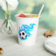 Un campeonato de fútbol de fondo azul. Este diseño parece realmente efectivo en estas tazas de papel