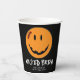 Una cara de calabaza vestida para Halloween con una sonrisa de calabaza espeluznante y una cicatriz cosida en la frente en esta taza de papel para niños de Halloween. El texto opcional dice 'Bruja perversa, un pequeño sorbo no te mata'. Busque ID224 para ver otros productos con este diseño.