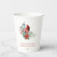 Navidades Familia Reunión Cardenal Rojo Fiesta Cups de papel. Un animado cardenal rojo se sienta en un festivible ramo invernal de bayas rojas, ramas de pino, vegetación eucaliptos, y un hermoso poinsettia de vacaciones por encima de un texto de ejemplo que muestra el título y la fecha/año de la reunión de Navidades de tu familia. Todos los ejemplos de texto a ambos lados de las tazas de papel se pueden revisar fácilmente con sus propios detalles sobre la plantilla de personalización.