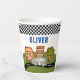 Carreras Car Road House Nombre personalizado Copas de papel de cumpleaños. Únete a nosotros para una inolvidable fiesta de cumpleaños con un tema de carreras de autos - un auto simple con tu número de edad en una calle con casas y árboles. Tu pequeño corredor tomará la rueda y conducirá por la calle. ¡Prepárense para un día de juegos y dulces divertidos! Añade tu nombre y número de edad.