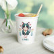 Cute kawaii gato de color verde azulado sentado entre dos jarrones de flores y el corazón a cada lado con el texto dice Cat Lover. Este es un gran regalo para los amantes de los gatos.