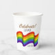 Estas Copas de papel TEMÁTICAS del ORGULLO incluyen la bandera LGBTQ. Encima de la bandera, el texto dice "¡Celebren!" y debajo hay un área para texto personalizado.
