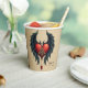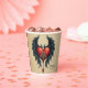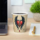 Celtic elegance with a heart and wings. An elegant, decorative frame characterized by Celtic knotwork. A vibrant red heart stands out as a central element at the bottom of the design. Within the heart is a Celtic knot symbol, symbolizing connection and protection. The heart is flanked by dark, feathered wings, giving it a majestic and protective appearance. Delicate peach blossoms with yellow centers are arranged on either side of the heart.