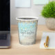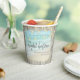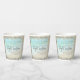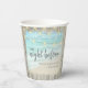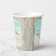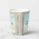 Estas tazas de papel para cena de ensayo de boda costera rústica presentan una escena de olas del océano azul aguamarina chocando contra la playa, con un marco de madera desgastada y luces de cuerda que acentúan la parte superior. Echa un vistazo a la colección para encontrar platos de papel y servilletas a juego, y otros adornos para la mesa.