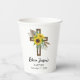 Happy yellow sunflowers, eucalyptus, and earthy pampas grass displayed on a dark wooden cross create an elegant floral design for your baptism party cups. These paper cups are perfect for any late summer or autumn baptism.