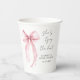 Tazas de papel elegantes para despedida de soltera con una hermosa aquarela de un lazo coqueto rosa claro, "Ella está atando el nudo" en una elegante caligrafía, y el nombre de la novia y la fecha de la despedida en letra moderna simple.