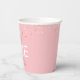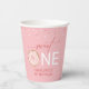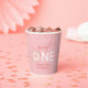 Estas tazas de papel están diseñadas para un fiesta de primer año de chica. El texto moderno dice "ONE dulce" acentuado con un donut espumoso rosado y rociadores de color. Personaliza con el nombre del niño.