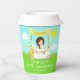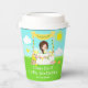 Esta taza de papel tierno y caprichoso tiene un chica de pelo castaño con piel clara en un puesto de limonada amarilla decorado con flores y lienzo. En el fondo hay un cielo azul, sol y mariposas. El texto combina fuentes decorativas y sans serif para un estilo elegante y moderno. Esto es perfecto para una fiesta de cumpleaños de verano. Gráficos de MUJKA