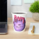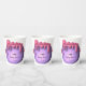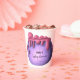 Un bebé adorable está preparando tazas de papel de chica de Halloween con un ilustracion de un caldero de bruja que burbuja en colores rosa y violeta. Ilustrado y diseñado por Patricia Álvarez.