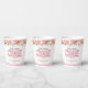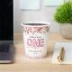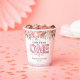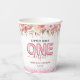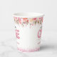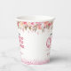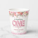 Modernos vasos de papel fiesta chica de primer cumpleaños con un fondo blanco simple, purpurina y confeti brillante, florales de color agua rosado bonito, el dicho "señorita una maravilla", nombre de sus hijos y fecha del fiesta.