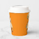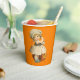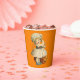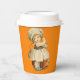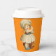 Papel tazas de Halloween con una postal de la Viñeta Ellen Clapsaddle Halloween de una linda niña con un vestido anticuado, tallando una manzana y tirando la cáscara sobre su hombro por suerte. De un juego en el que la petición era para especificar el nombre o las iniciales del futuro del niño prometido.