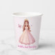 Copas de papel para chicas con un diseño de princesa adorable con espacio para personalizar un nombre. Ideal para tomar una copa y añadir un toque divertido a una fiesta de cumpleaños temática de la princesa.
