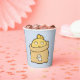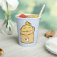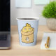 Pollo amarillo aburrido sentado en una bolsa de comida. ¿Atrapado? Yeah. ¿Preocupado? En realidad no.