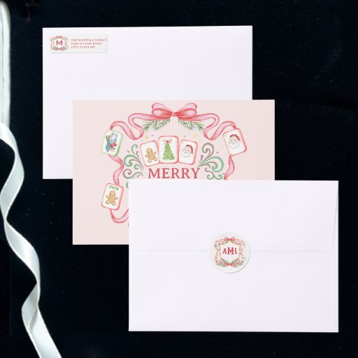 This chic Christmas design features a bamboo and ribbon frame with mahjong tiles and a phrase that says "Let's pay mahjong." Perfect for you holiday mahjong party.