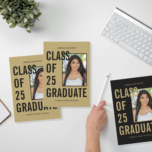 La foto de tu graduado, rodeada de grandes letras en negrita "CLASE DE 25 GRADUADOS", terminó con tu nombre y la escuela secundaria. Añade tu propia foto y otros detalles siguiendo el enlace "Personalize". Los colores negro y oro también se pueden cambiar, para que coincidan con los colores de la escuela de tu graduado, usando el menú de edición. Si quieres ayuda, por favor siéntete libre de contactarme vía mensaje aquí en este sitio o email en susanmingaydesigns@gmail.com