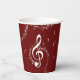 G Clef entre notas de música en un rojo profundo. El fondo rojo oscuro hace que aparezcan las notas blancas brillantes. Diseño de música blanca y marrón,