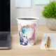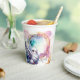 A dynamic and colorful background highlighted by a golden circular frame, showcasing a delicate watercolor painting of a dove prominently placed in the foreground.
