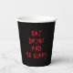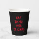Coma bebidas y sé espantosa sangre de vampiros rojo tipografía espeluznantes y graciosas tazas de papel fiesta de Halloween. Texto de personalizable de sangre roja sobre fondo negro. Personalizable completo de texto, para que puedas escribir tu propia frase.
