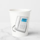 Un teléfono con una pantalla que dice que nos contactes. Este diseño parece realmente efectivo en estas tazas de papel