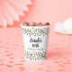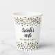 Elegante purpurina de confeti negro y dorado en una taza blanca de papel de cumpleaños número 80. Personalizado con el nombre del invitado de honor y su edad.
