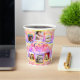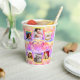 Las tazas de la fiesta de cumpleaños del papel dicen, "La mejor eternidad" con un hermoso pastel a neón - como fondo a cuadros en colores violeta, amarillo, rosa y naranja, un arcoíris y corazón a juego, además de 6 plantillas de fotos para descargar fácilmente fotos de tus 6"mejores" a.