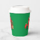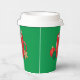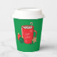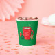 Una taza de papel verde festivo para su fiesta de vacaciones con el diseño de una taza roja llena de chocolate caliente y coronada con malvaviscos. También hay un bastón de caramelo en el interior, así como una galleta de Navidad a la derecha y dos pequeños adornos a la izquierda. Las palabras "Felices Fiestas" están escritas en letras blancas . Mire en la colección para encontrar las placas y servilletas correspondientes. © ArianeC Ilustraciones-Todos los derechos reservados