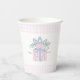 Todos los días se ofrecen tazas de papel con la temática de un regalo, con un regalo de color pastel rosa y unas tapas de gingham rosas.