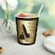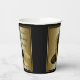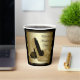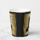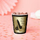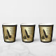 Las mujeres zapatos de tacón alto negro y dorado para la fiesta de cumpleaños tazas de papel con zapatos altos de tacón purpurina de oro sobre un elegante fondo negro y dorado. Puede agregar el texto de su elección a estas tazas de papel negro y oro de bonito.