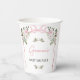 Croquette Pink Bow Floral Baby Shower Cups Sweet winter Pink Pies y una taza floral de papel para bebé con un marco de arco rosa y algunos arreglos florales de invierno sobre un fondo rosa y blanco. Esta floral de invierno, una niña dulce está en camino de la taza de papel de ducha para bebés es ideal para una ducha de chica de invierno.
